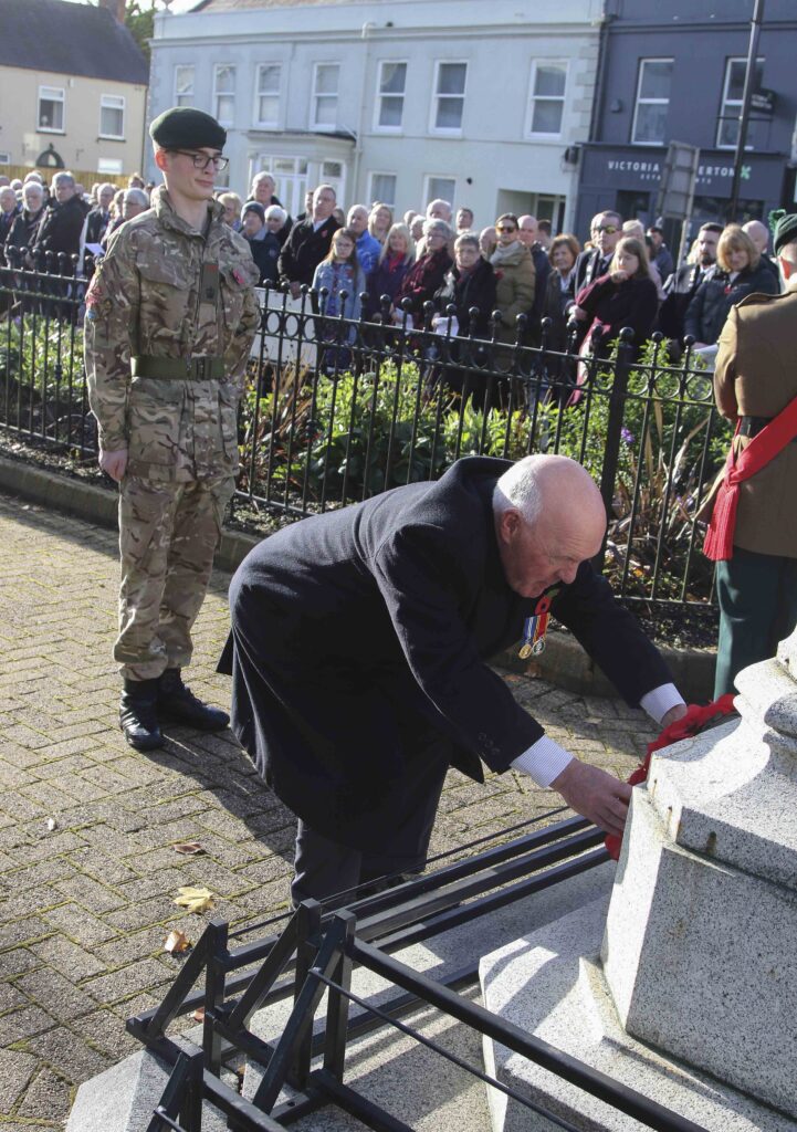 Deputy Lieutenant Colin Lammey lays the first wreath at the Comber War Memorial, escorted by Cadet Sgt Major Tristan Dempster.
