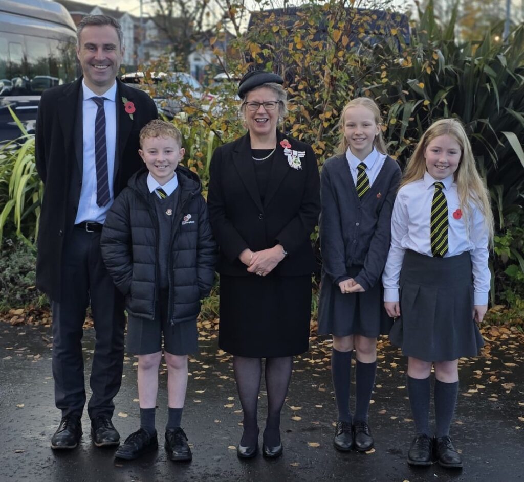The Vice Lord-Lieutenant, Catherine Champion, laid the first wreath at the War Memorial in Holywood on Remembrance Sunday.  Many wreaths were laid by individuals and organisations.  She is pictured with Holywood Primary School Principal, Dr Graham Walker, and the P7 members of the Student Council who laid a wreath, Theo, Annie and Claire.